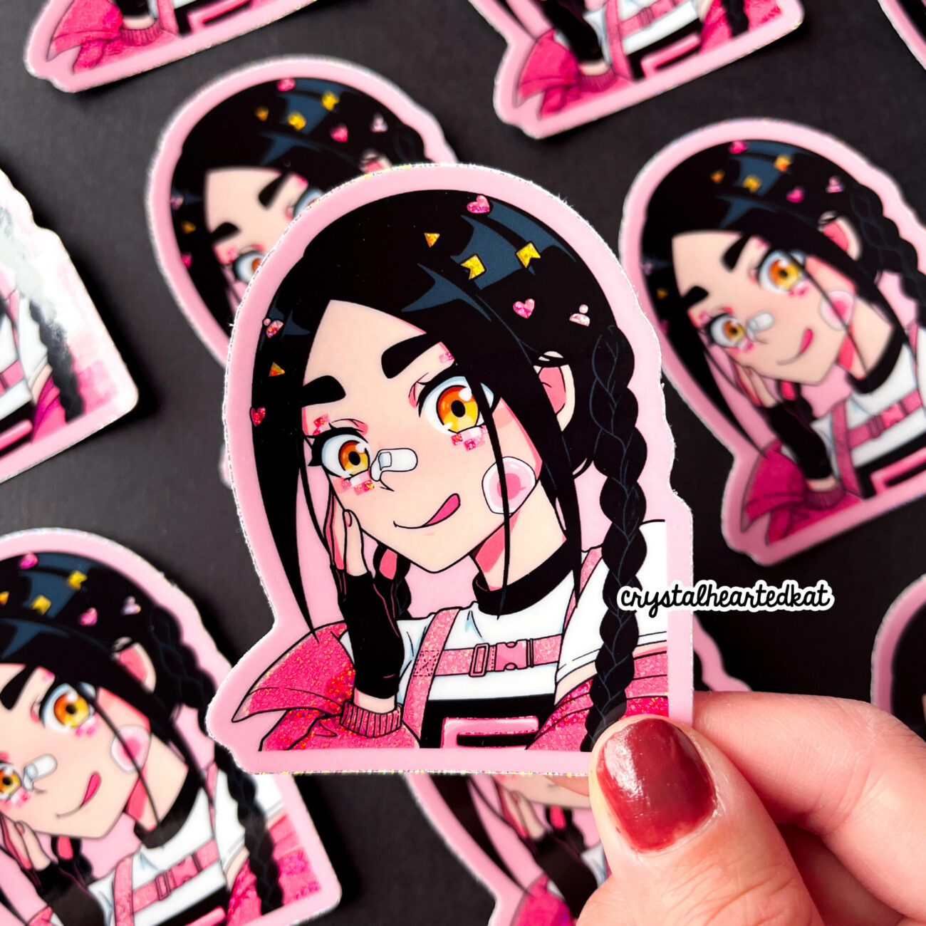 A vinyl sticker with glitter accents, featuring an original anime character I drew to celebrate 5k follows on IG! She has little clips in her hair in the shape of the ‘save’, ‘like’, ‘play’, and ‘follower’ icons!
