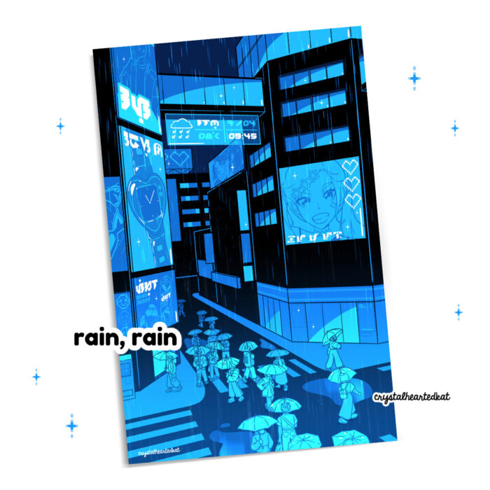 An 11″ x 17″ art print of my Rain, Rain illustration, featuring a rainy night in the imaginary neighborhood of Topasiya in my Crystal Hearted City.