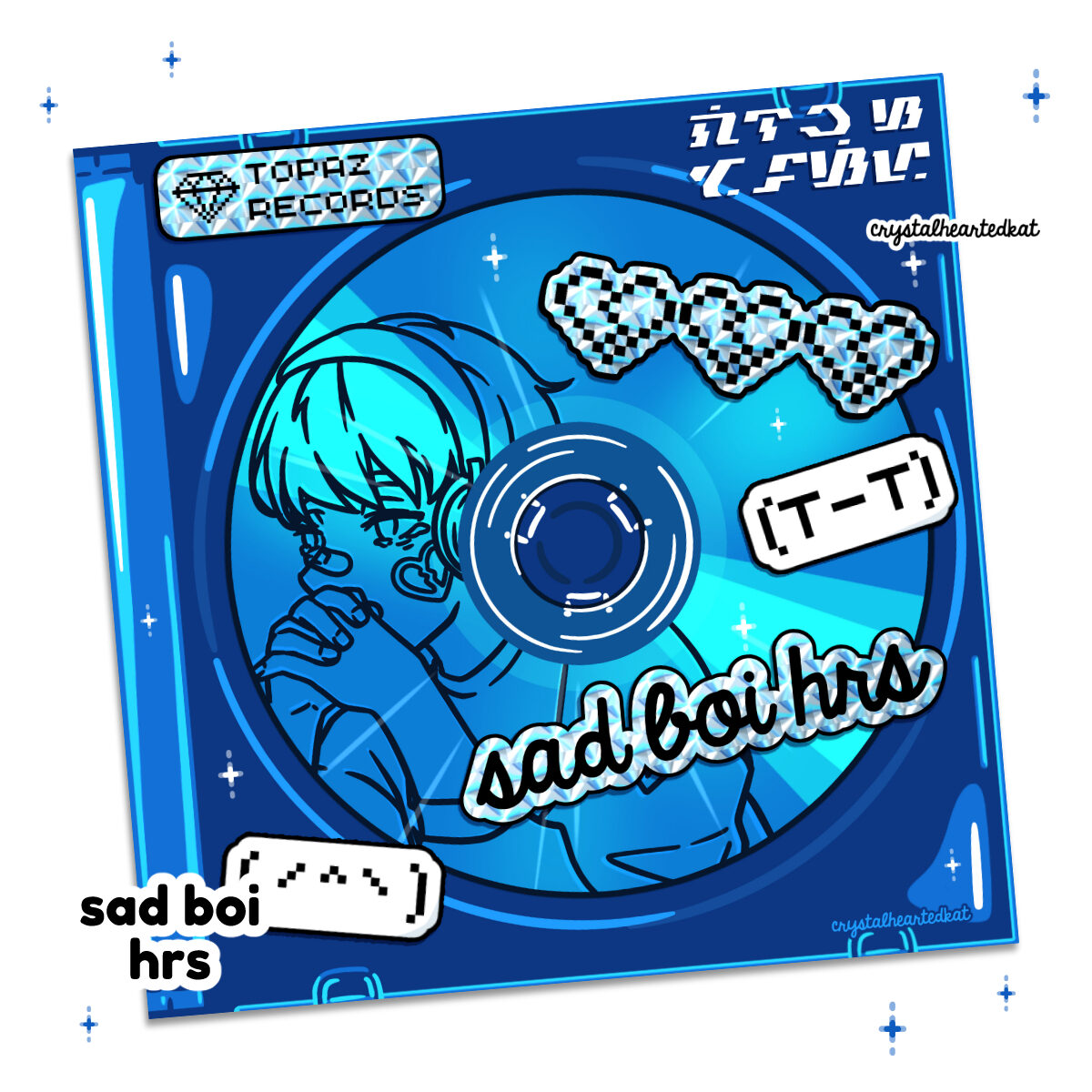 An 8″ x 8″ art print of my Sad Boi Hrs illustration that features an Sad Boi Hrs CD case with an original character and stickers on it.